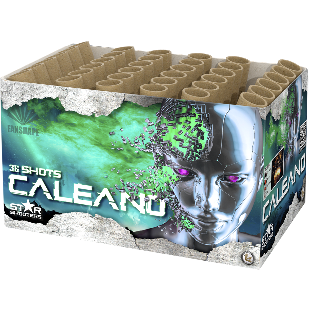 Caleano n nExtreem brede, knetterende batterij met 36 schoten in waaiervorm. Enkelvoudige verpakking n nKaliber 25 nAantal schoten 36 nBrand duur 20 Seconden Caleano Goedkoop vuurwerk kopen bij Vuurwerkwinkel Etten-Leur