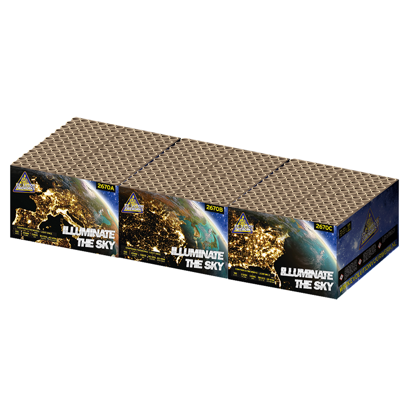 De Illuminatie the Sky van Evolution Fireworks is een 3-delige compoundset van in totaal 300 schoten. Met drie dikke compounds van ieder 100 schoten siervuurwerk zet u in volgorde van A naar B naar C een complete vuurwerkshow neer. Alleen de allerbeste effecten zijn door Evolution selecteert om met deze set een waardige opvolger voor de befaamde Evo Force One set te brengen.
