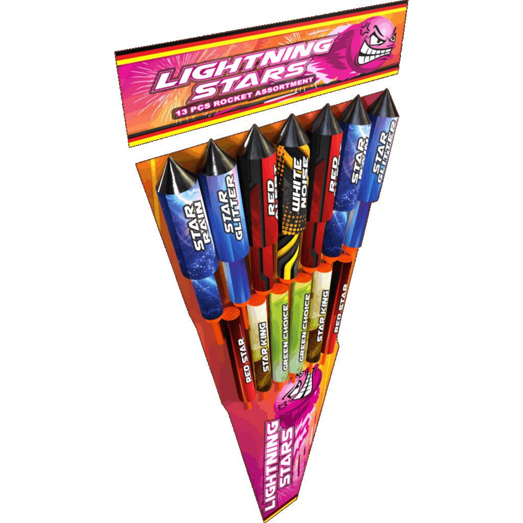 n13 beeindruckende Raketen in zwei Größen mit verschiedenen Effekten. Diese Raketen verwandeln die Nacht in Lightning Stars!