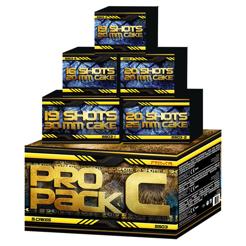 Pro-line Fireworks, Pro-Pack C, een 5-delig siervuurwerkpakket. Dit is de nieuwe stijl sierpakketten van Pro-line Fireworks. Door verschillende aanpassingen in de regelgeving in Nederland is dit vuurwerkpakket weer helemaal up-to-date. In het pakket zitten vijf dikke siervuurwerkpotten. Een cake met 19 schoten in 20mm kaliber, een cake met 16 schoten in 20mm kaliber, een cake met 20 schoten in 20mm kaliber, een cake met 19 schoten in het maximale 30mm kaliber en een cake met 20 schoten in 25mm kaliber.