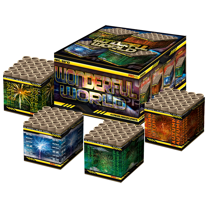 Wonderful World, cakeselection met 4×25 shots siercakes. Dit vuurwerkpakket bevat vier siercakes welke ieder 25 schoten afvuren. Een leuke set met verschillende effecten voor de liefhebber welke het leuk vindt om meerdere lontjes aan te steken tijdens zijn oudejaarsavond.